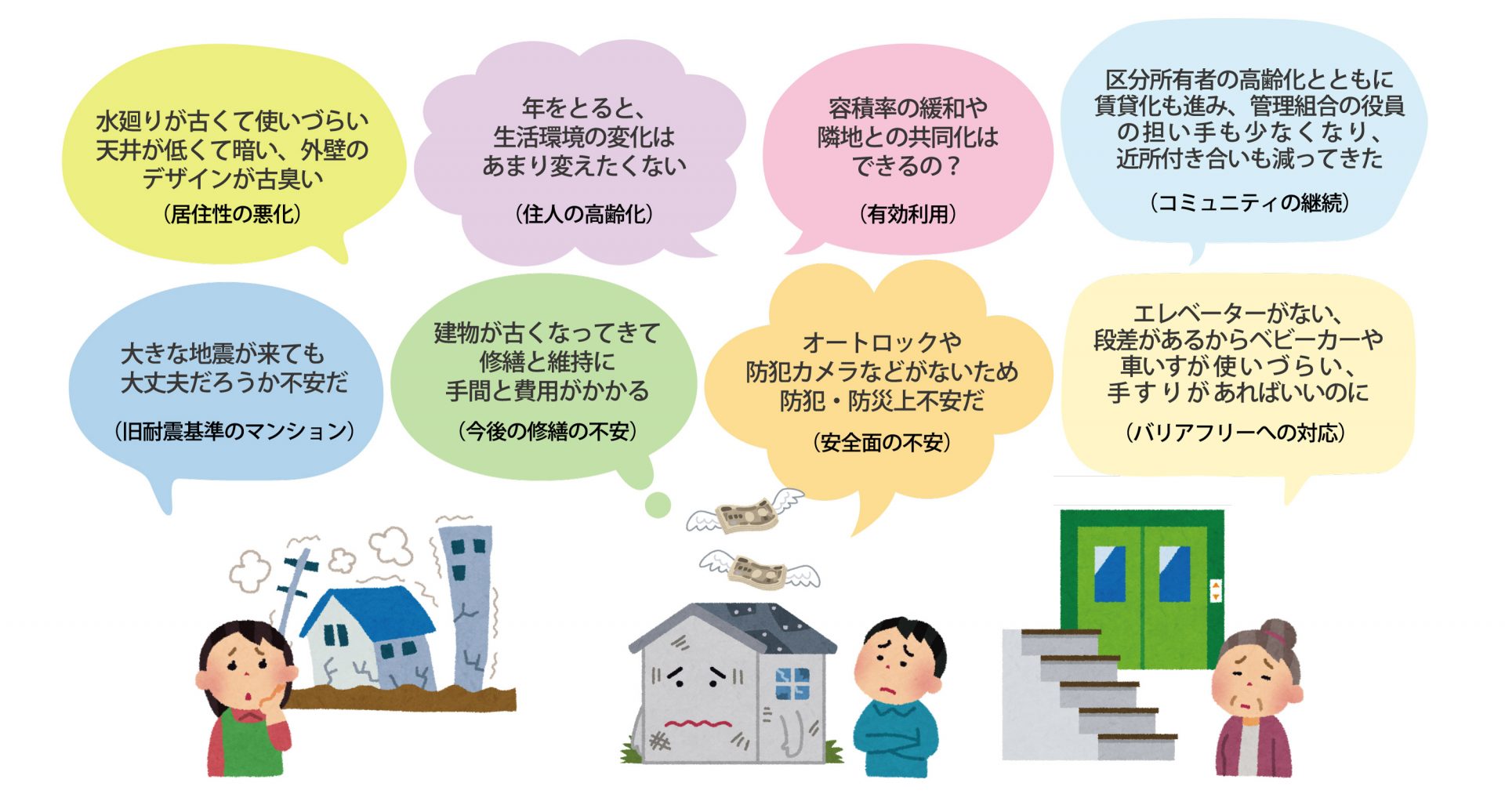年月の経過とともに、マンションも新築当初には考えられなかった課題が生じてきます。これらの課題への対応を