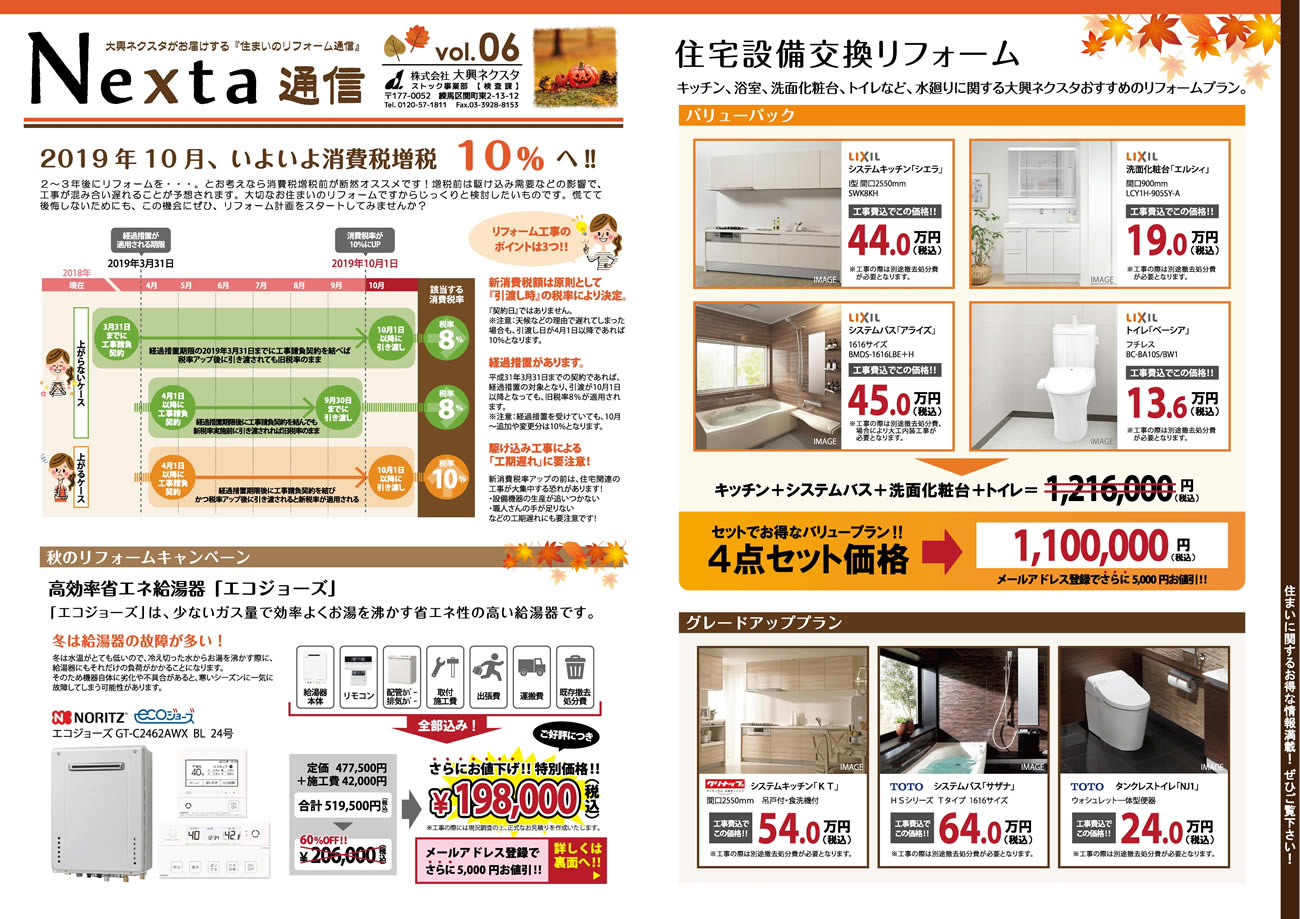 大興ネクスタがお届けする『住まいのリフォーム』通信、「Nexta通信2018年10月号」を発行いたしました。 来年に控えた、気になる消費税10%について、秋のリフォームキャンペーン、お得なリフォームプラン・・・ 住まいに関するお得な情報が満載です!ぜひご覧ください!