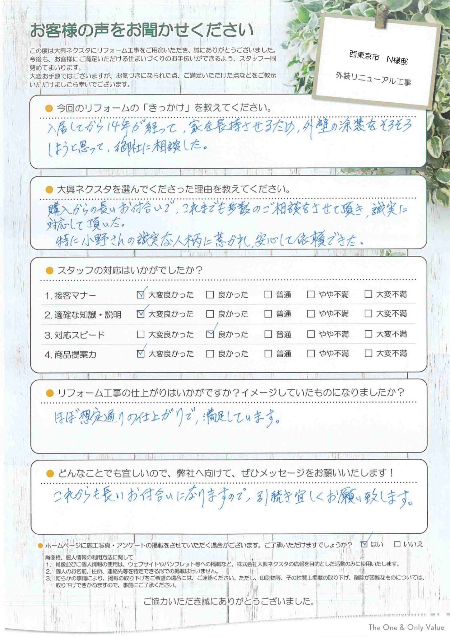 特に、小野さんの誠実な人柄に惹かれ、安心して依頼できた。