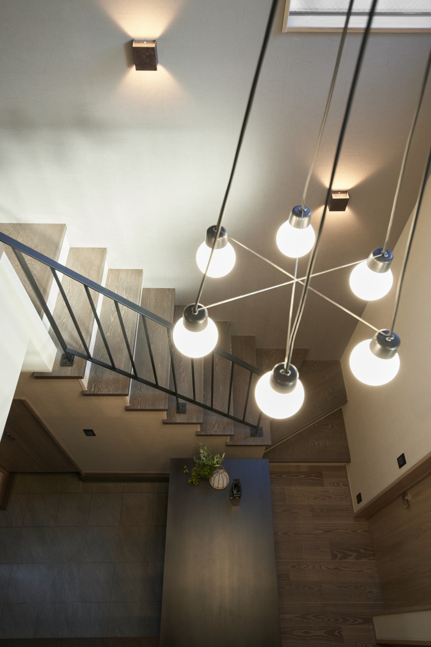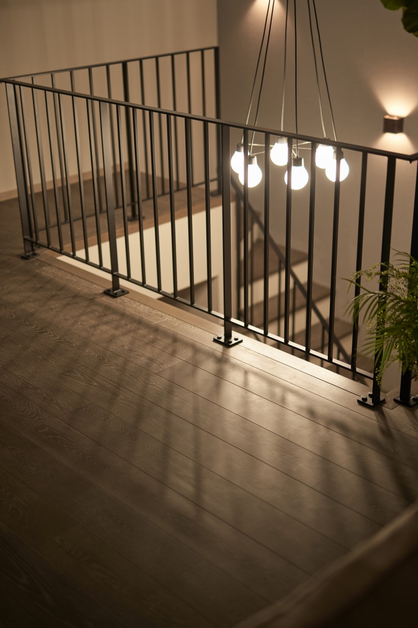吹き抜け階段に設置した壁付照明も昼白色の優しい光が上下に広がっているので、夜間はしっとりとした雰囲気に。