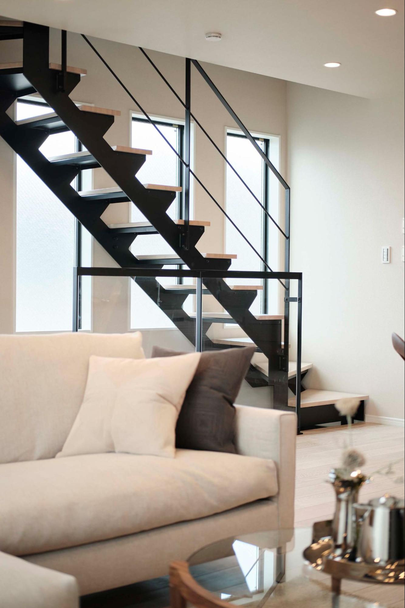 暗くなりがちな階段ホールも、スケルトン階段の隙間と吹き抜け窓から自然光を取り込むことで明るい雰囲気に。