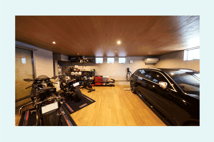 スキップフロアの大きな収納や広々としたシアタールーム。なによりSE構法だから叶えられた大スパンの大きなガレージは、大型バイク2台と自家用車を停めても、メンテナンスの作業が余裕でできる広さに。まるでショウルームのようなデザインのガレージは、自慢のコレクションを楽しめるように小窓をつけ、別の部屋からもバイクや車を眺めることができます。