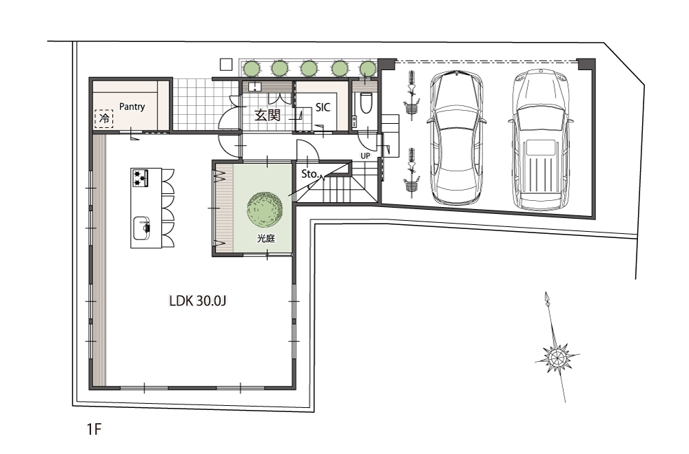 ビルトインガレージも、2台がじゅうぶんに停められる広さ。趣味を楽しむ場所としても使えます。