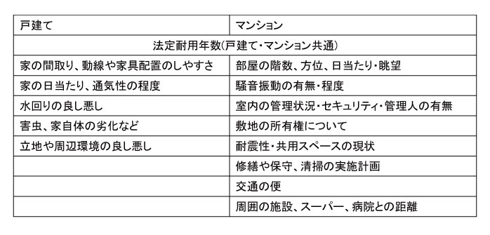 査定額の根拠となる項目は、共通しているものもあれば建物の種類によって異なるものもあります。共通している査定項目も含め、自身の建物にあった査定項目を知っておきましょう。以下が査定項目の一覧です。