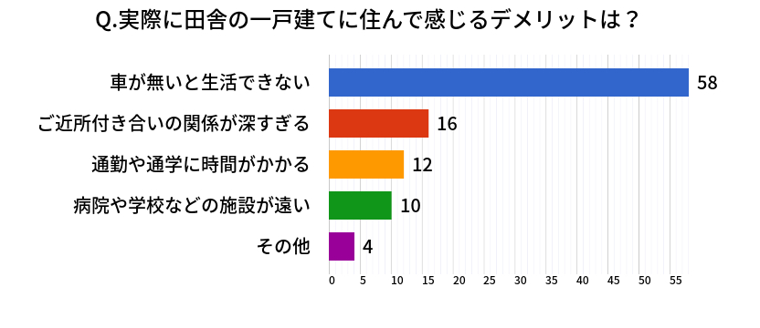 「実際に田舎の一戸建てに住んで感じるデメリットは何ですか?」というアンケート調査を行ったところ、「車が無いと生活できない」という回答が圧倒的に多く58%を占めました。「徒歩で買い物にいける距離にお店が無いことが多く、車を保有していないと不便。」「自家用車を2台所有おり、金銭面での負担感が大きい。」といった声が挙がっていて、車社会であるため徒歩圏内に買い物できる場所が少ないことや、車を所有することでのコスト面に関して不満を感じやすくなるようです。