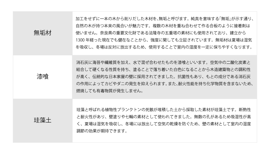 天然素材には上記の3つのほかにも、瓦やタイルなどの陶器、畳、ふすまに使われる和紙などがあります。木材以外は原料を加工して作るものですが、その過程で人工的な化学物質を使用しないため、人体にも安全です。従来の日本家屋のように安心できる素材だけでつくった家で生活できることこそ、天然素材の家のメリットといえます。