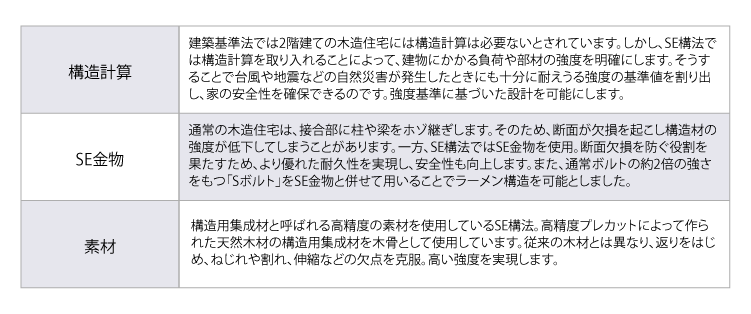 上記のようにSE構法は、「構造計算」「SE金物」「素材」において従来の木造住宅にはなかった手法を採用しています。柱や梁などの主体構造はもちろんのこと、建築全体の構成方法を多角度から高める取り組みを行っていることこそが、SE構法が木造住宅で優れた耐久性を発揮できる理由なのです。