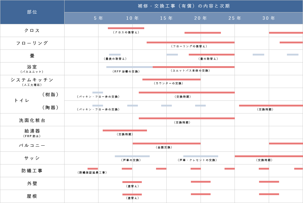 住まう方に寄り添った住宅であるモデューラにおいても、5年、10年と年を重ねるにつれて汚れてきたり、傷んできたりすることは避けられません。少しでも住まいに満足できる時間を長くできるように、適切な時期に適切なメンテナンスを行うことが大切です。住まいはそれぞれの部位で傷み始めるタイミングが異なるので、それぞれのメンテナンスのスケジュールを事前に把握しておくことが求められます。