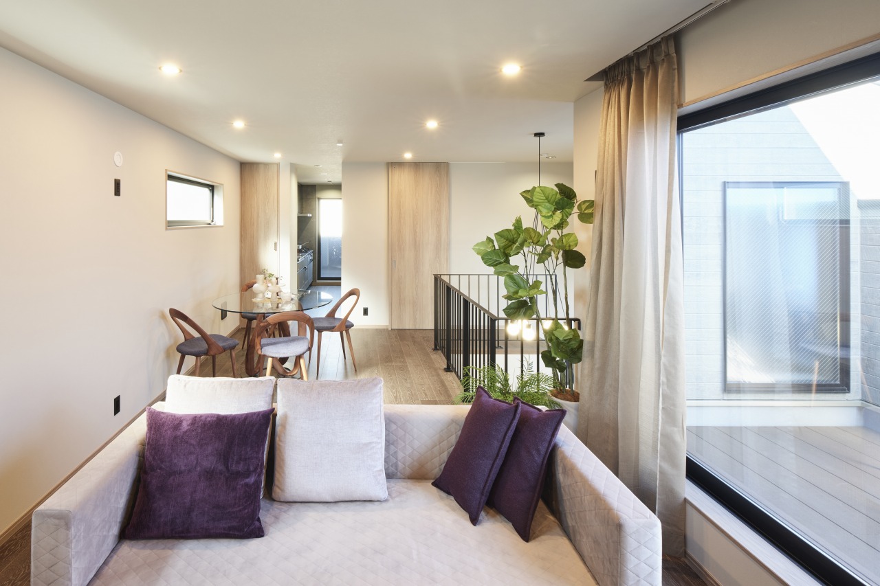「玄関に入ってすぐコートを脱いで、手洗いをして」「ゴルフから帰って、道具をしまって、手洗いをして」と、くたくたになって帰宅してもスムーズな動線でリビングへ。階段を上がればすぐにソファーでくつろげます。