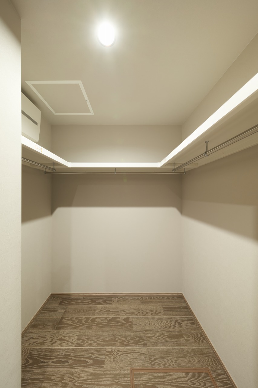 主寝室のウォークインクローゼットは、おしゃれにこだわる人に嬉しい贅沢な収納空間。セレクトショップで服を選ぶように、今日の装いを決める。毎日、気分の浮きたつ時間を過ごせそうです。