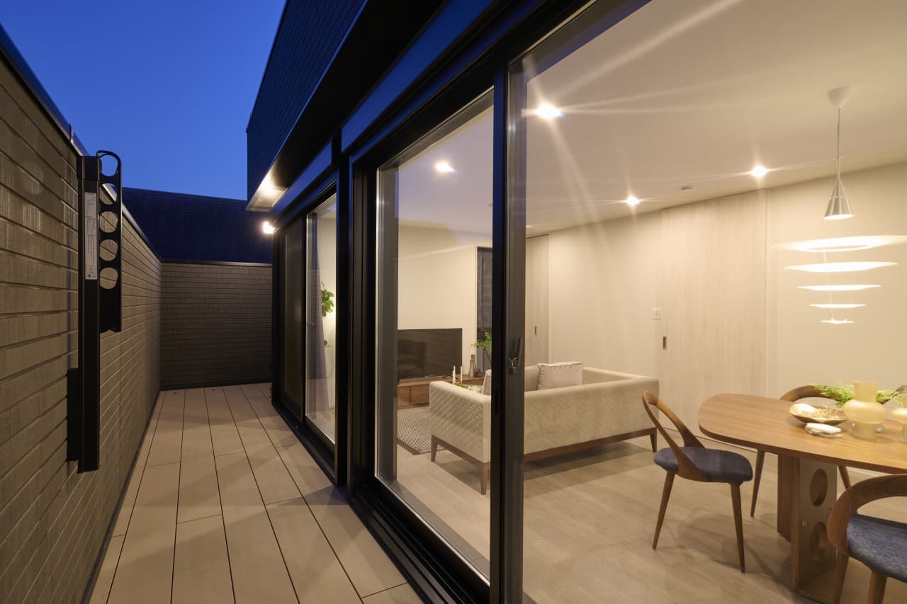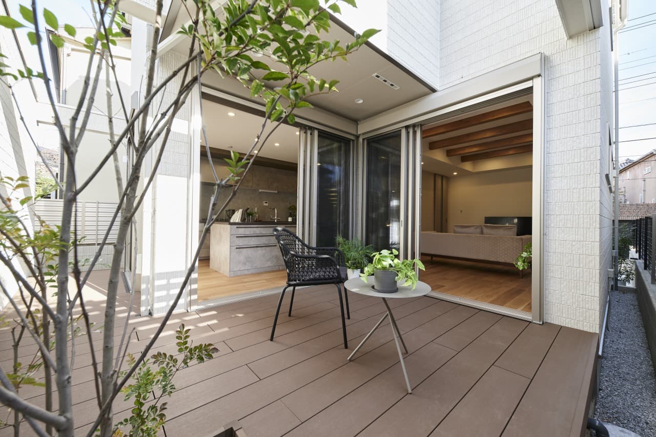 リビングから延びる連続したテラスは、魅力的な要素です。晴れた日には窓を開けて、オープンエアのリビングスペースとして楽しむことができます。その風景はまるでリゾートにいるかのような気分を味わえるでしょう。