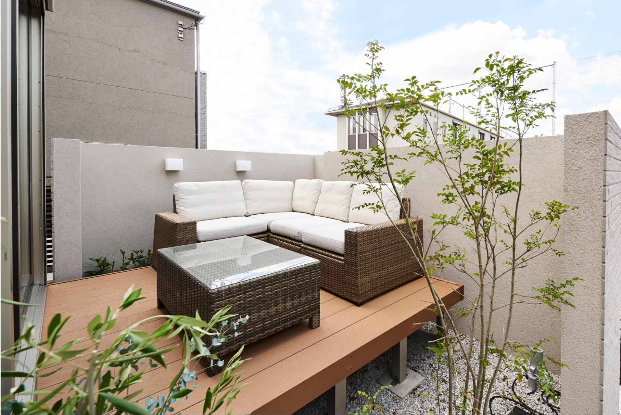 友人を招きたくなるようなこのリビングやテラスの空間が一番のお気に入り。もうお友達も何人も呼んでいます。