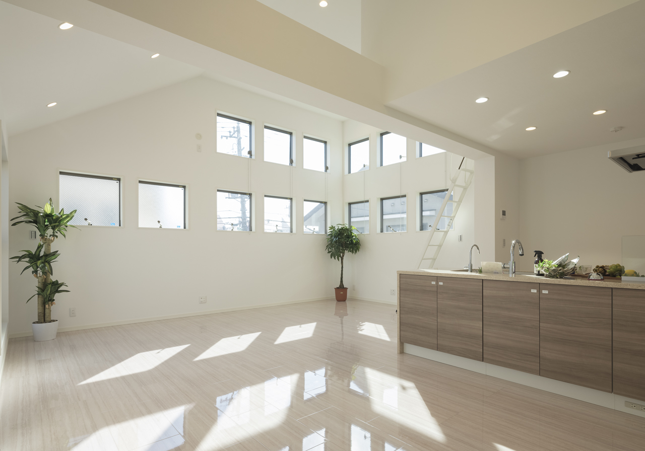 大開口の窓と高窓(ハイサイドライト)を組み合わせた自然光が明るいリビング。開口を大きくしても2階リビングならば外を行く人の目も気にならず、住宅地でも窓からの眺望を楽しめます。