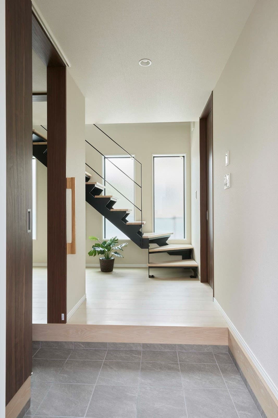 玄関土間のシューズクローゼットを回遊動線にすると、いつでもスッキリ片付いたホテルライクな玄関スペースになります。家族の靴の脱ぎ履きはシューズクローゼットで。普段履きの靴を出しっぱなしにしても扉を閉めれば気になりません。