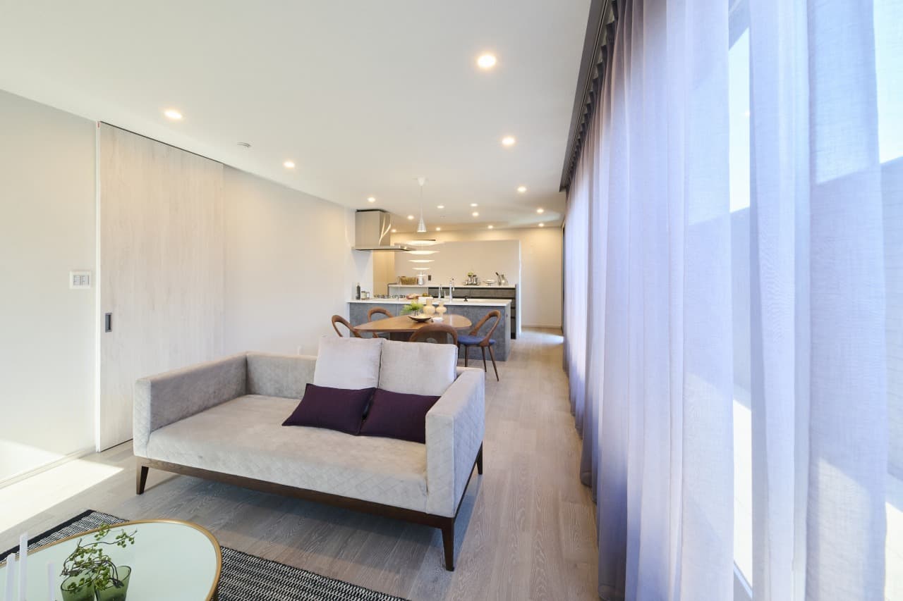 アイランドキッチンを起点に回遊できる、広々とした間取りのリビングです。天井まである大容量の背面収納は横長に設置。そのため広がりのある居住スペースを実現しました。