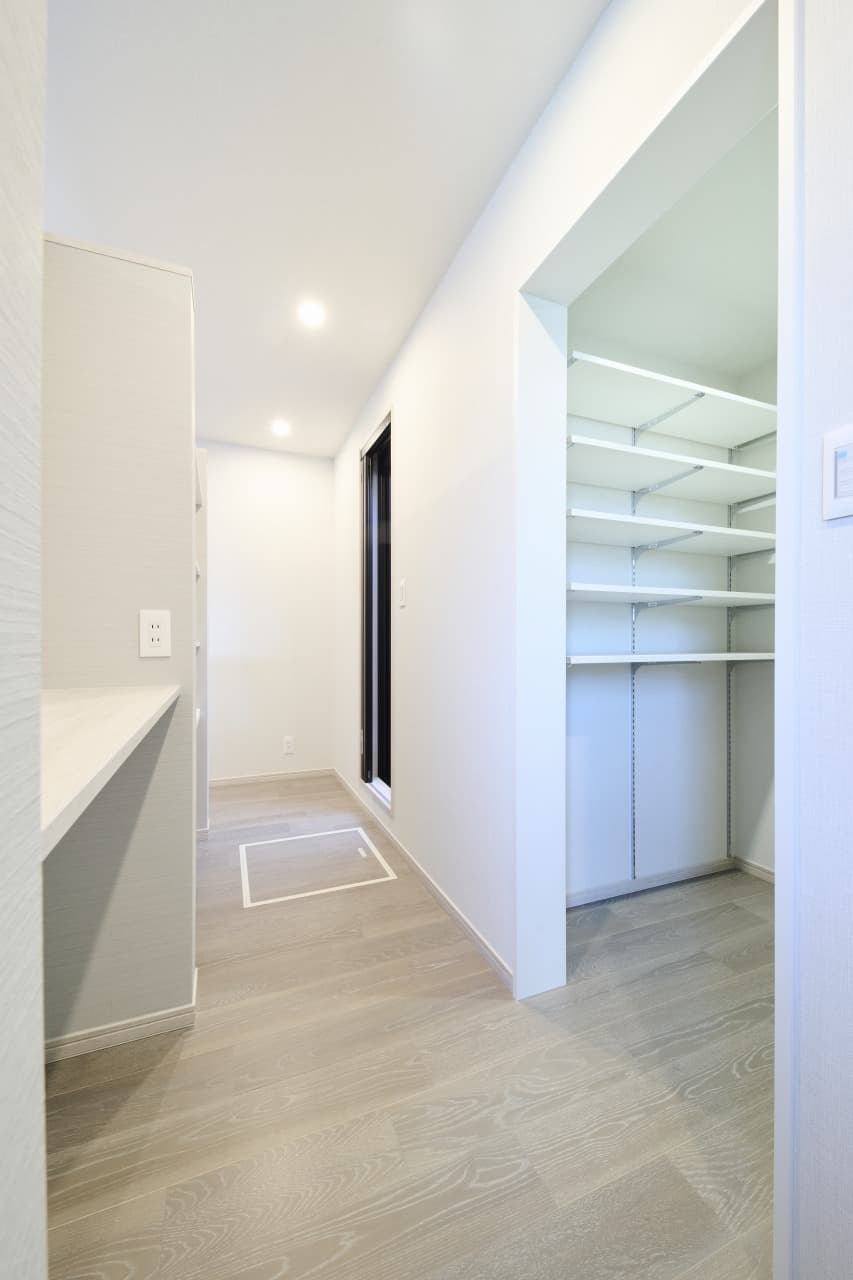 カウンターの裏側は作業スペースと大容量のパントリーとなっています。サブベランダへの出入口もあり、ゴミを保管しておけるなど、室内を清潔に保つ工夫も。