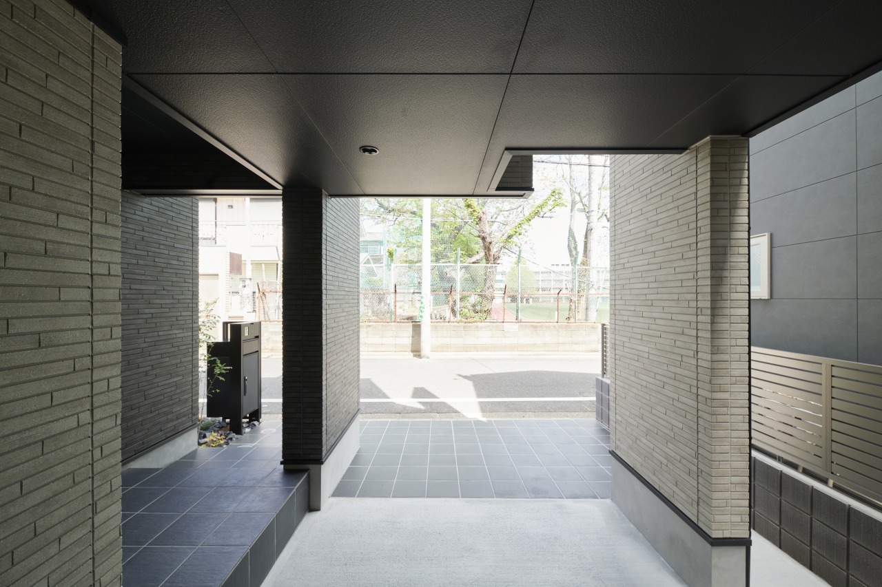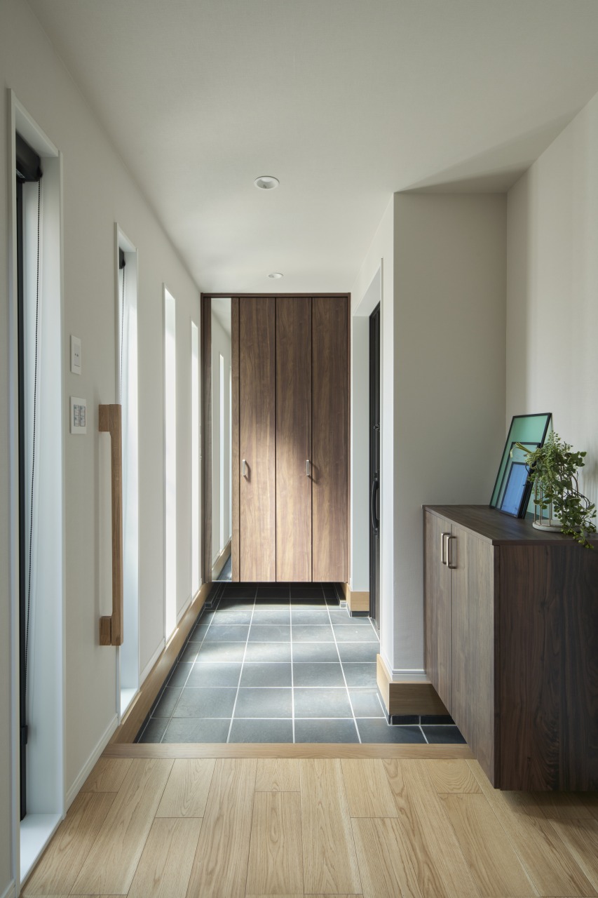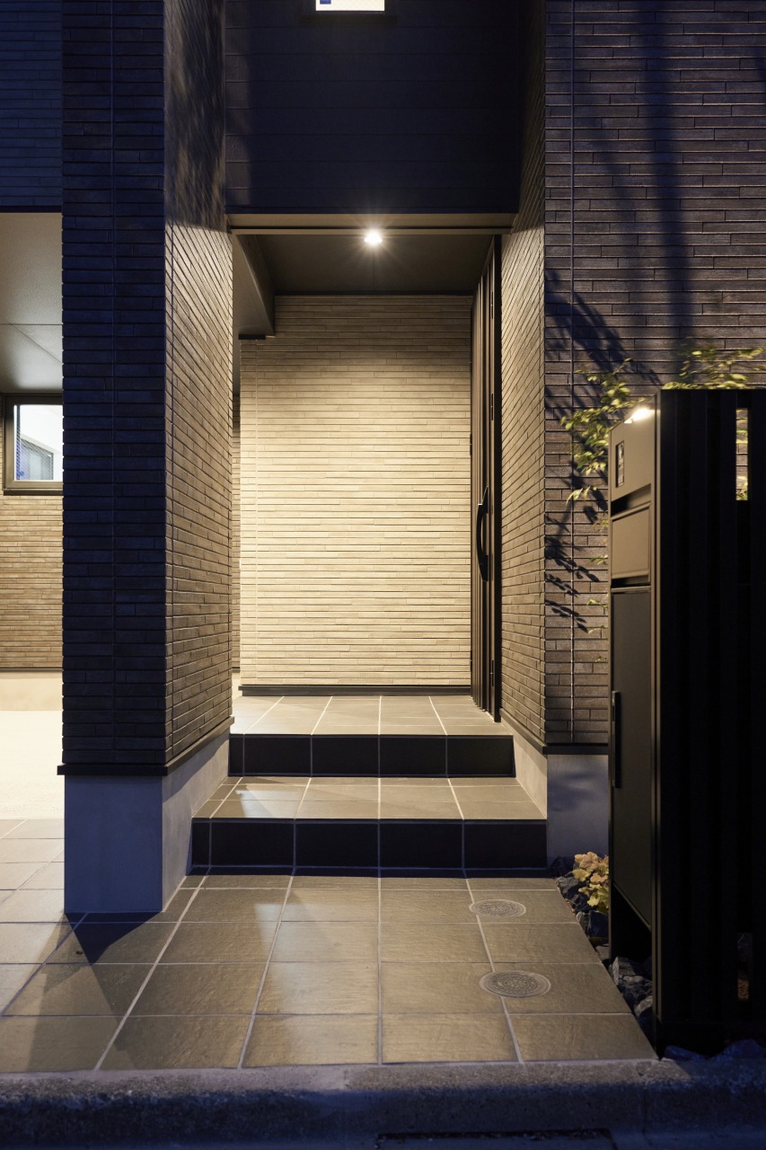 エントランスを印象的に彩るのはグレーのタイル。整然と配置されたタイルが奥行きの広がりと、秩序のある美を演出しています。