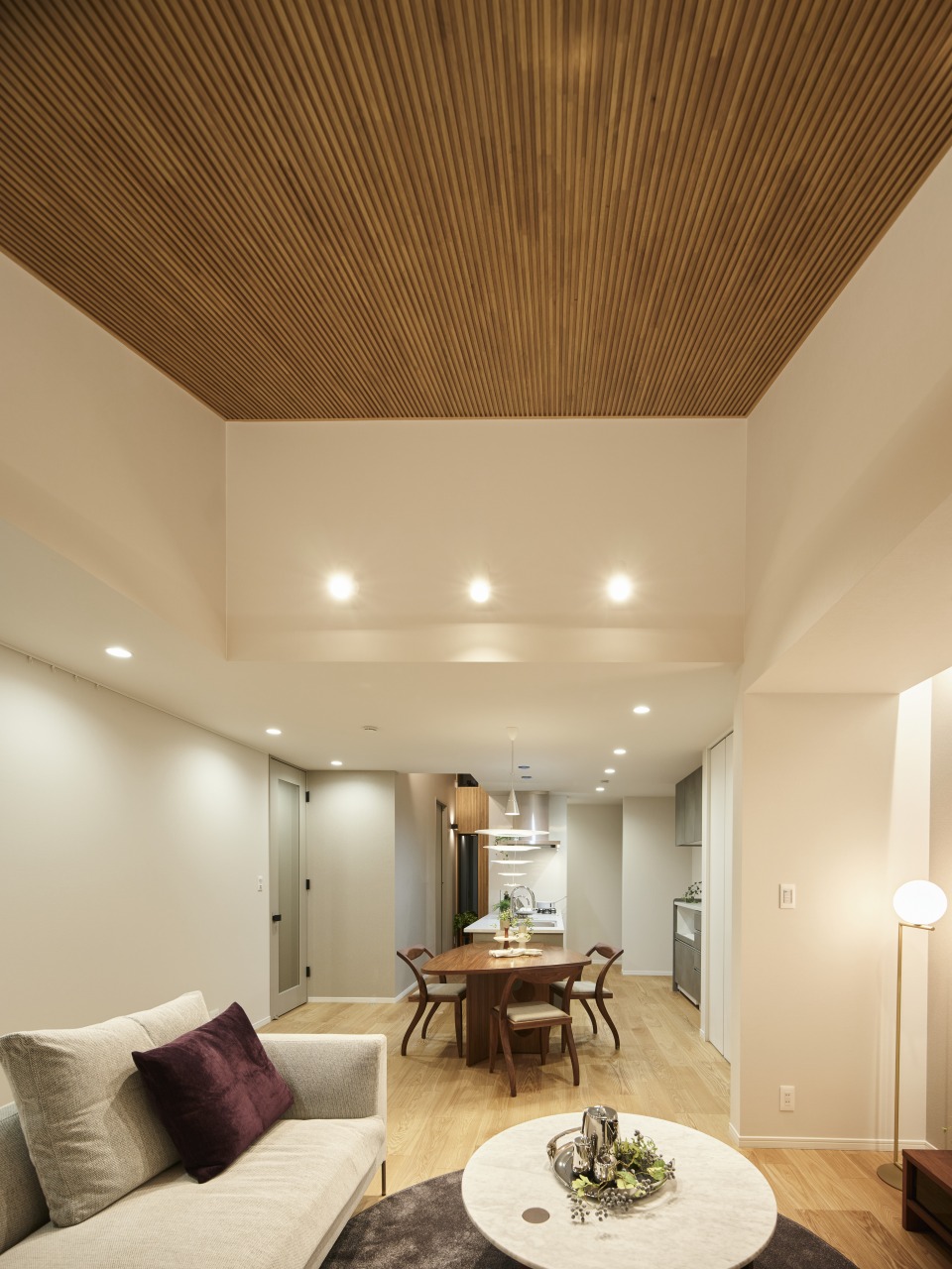 リブパネルの凹凸感に照明があたることで、室内にリズムが生まれます。和を感じる静寂の空間の中に、楽しさも加わったと感じています」