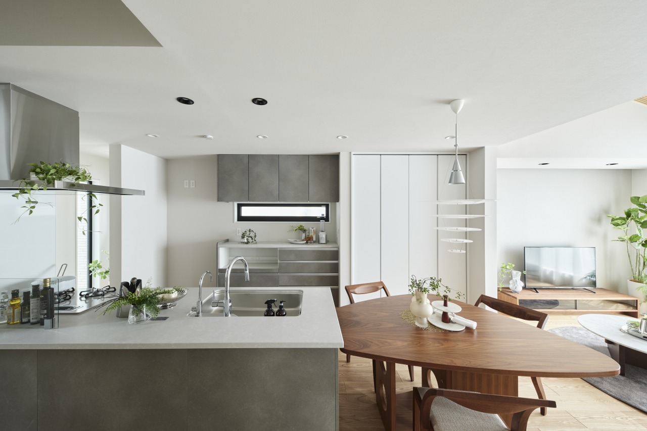 「ストレスのない快適な暮らしを実現するには、効率よく動ける家事動線を極める必要があります。特にキッチン周りは工夫しました。壁側にキッチンをつけてしまいがちなのですが、そうするとリビングとの一体感に欠けてしまって。さらにパウダールームにも遠回りになってしまい、ムダな動きが入ってしまいます。そのため、あえてキッチンの向きを横に変えて回遊型にしました。ダイニングテーブルをキッチンに付けられてLDKの一体感が生まれるうえ、効率的に動けるいい動線が組めたと思います」