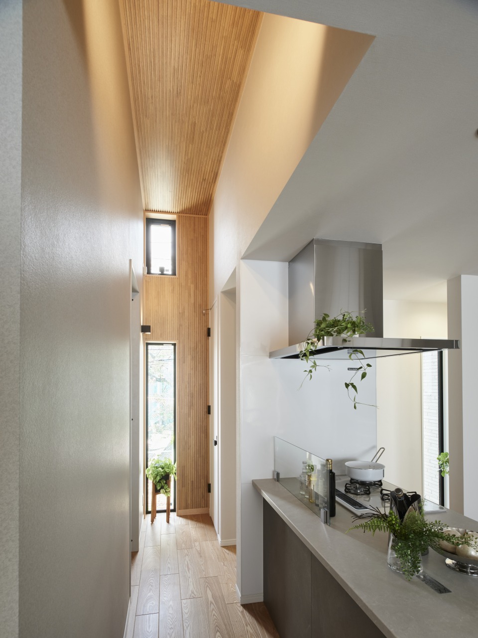 この家の隠れた見どころであるキッチン脇の贅沢な空間ですが、この天地の繋がり感を出すためには大変な苦労があったとのこと。