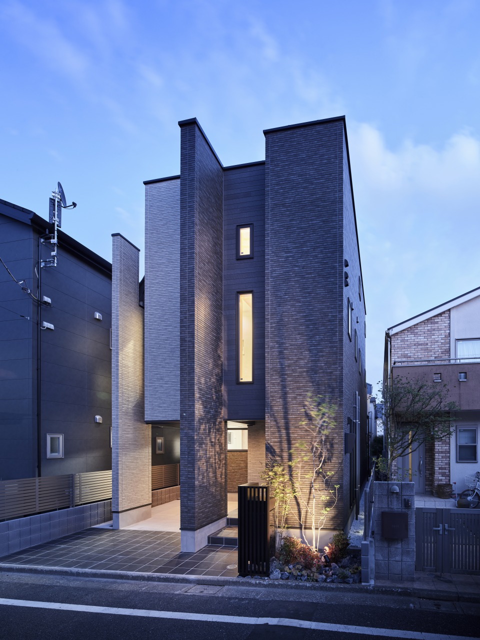 「三か所に袖壁を設置しているのですが、縦のラインを目立たせることで高さを出しています。またあえて凹凸させることで、ボリューム感と立体感を出しました。建物の規定によって屋根の高さに上限があるのですが、この袖壁を採用することで、制限された高さよりも高く見せられます。また、一般的な勾配屋根を隠す役割もしているので、他の家とは異なる特別感も演出しました」