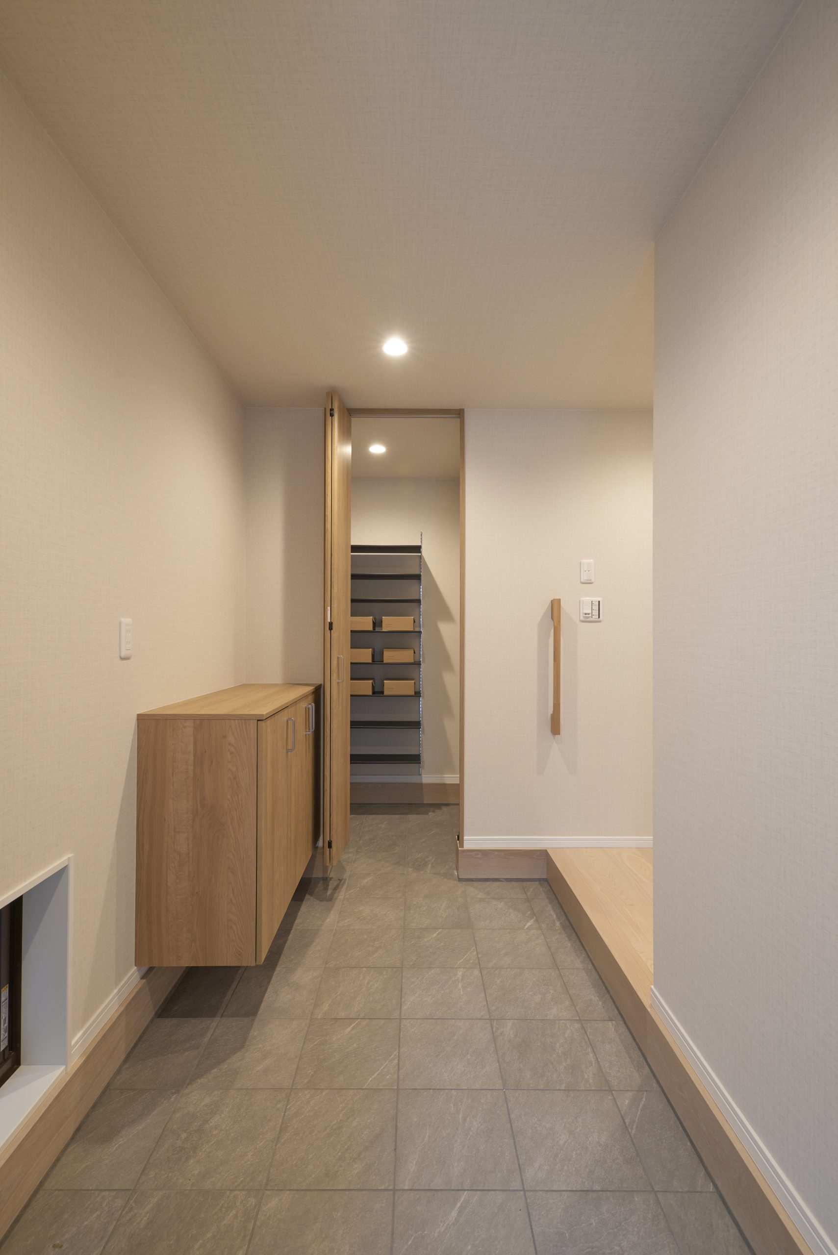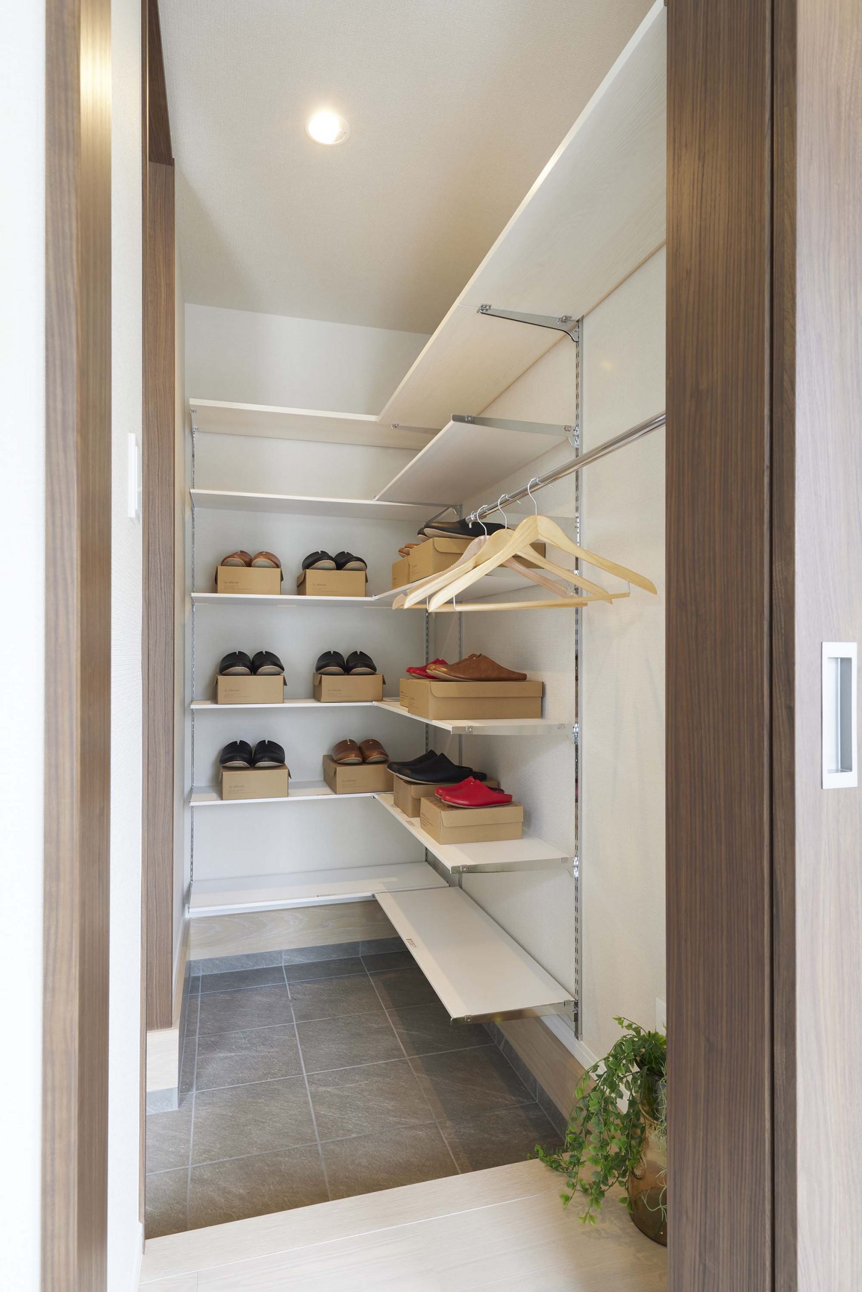 土間からも玄関ホールからもアクセス可能なウォークインの玄関収納。ちょっとした用事に履きたいサンダルなど、出しっぱなしの方が便利なものはこちらで脱ぎ履きすれば、急な来客時にも美しい玄関を維持できますね。