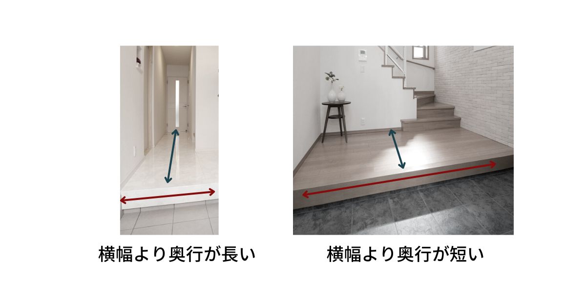 視覚的に、横幅が短く奥行が長い玄関ホールは圧迫感があり、狭い印象を与えます。同じ面積でも横幅の方が長いことで、視界の両側に空間が生まれます。玄関ドアから入ったときの横の広がりを意識した間取りにするのも広く見えるコツです。