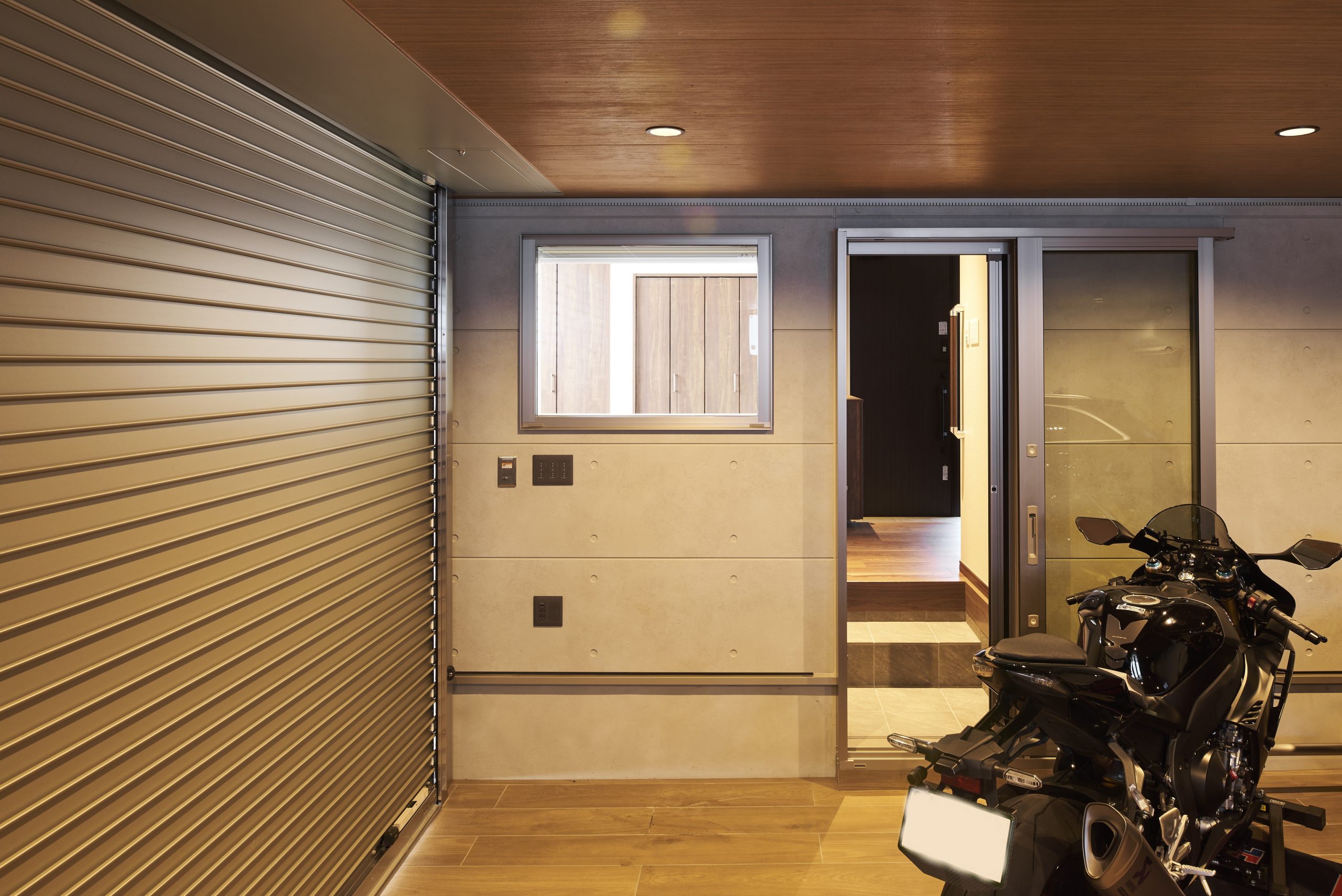 ビルトインガレージの愛車です。玄関ドアと対になったガラス戸からガレージが見えるから、圧迫感がなく空間の広がりが感じられます。