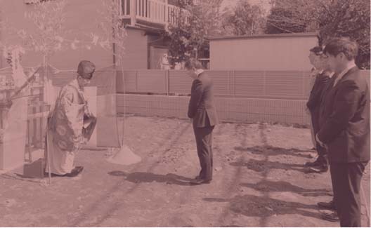 建築確認の許可が下りるといよいよ工事に入りますが、着工前に「地縄の確認」を行います。建築地において、建物の外形に合わせて縄を張り、お客様に建物配置のご確認をしていただきます。