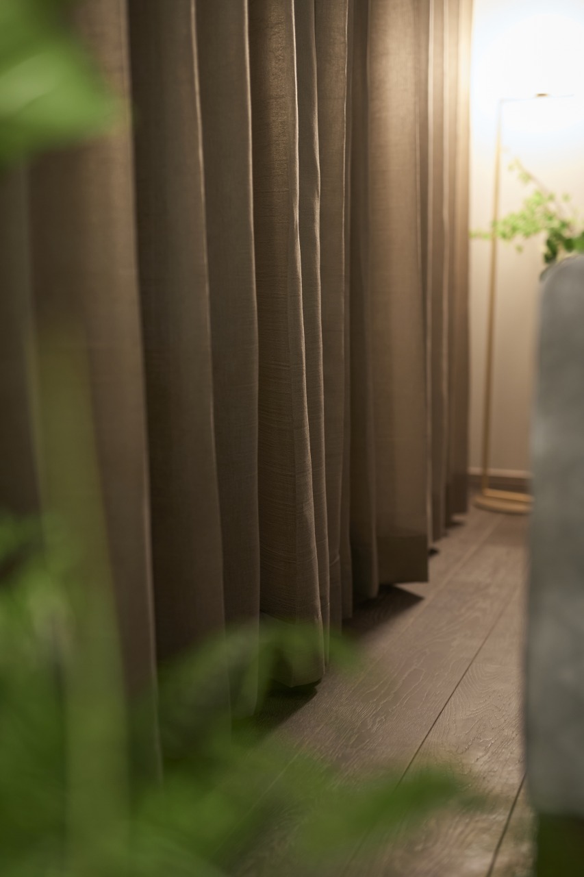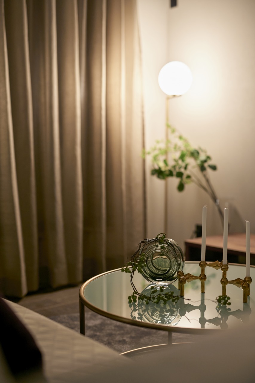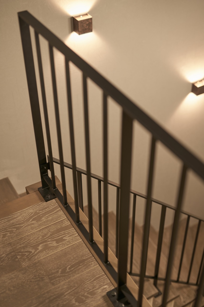 ここで採用している照明は、質感にこだわり素材の風合いを活かした照明。 壁付けの照明はヴィンテージ風の濃い茶色をセレクト。 光の広がりは、上下へと優しい光が広がり、縦に広がる空間を強調させる。