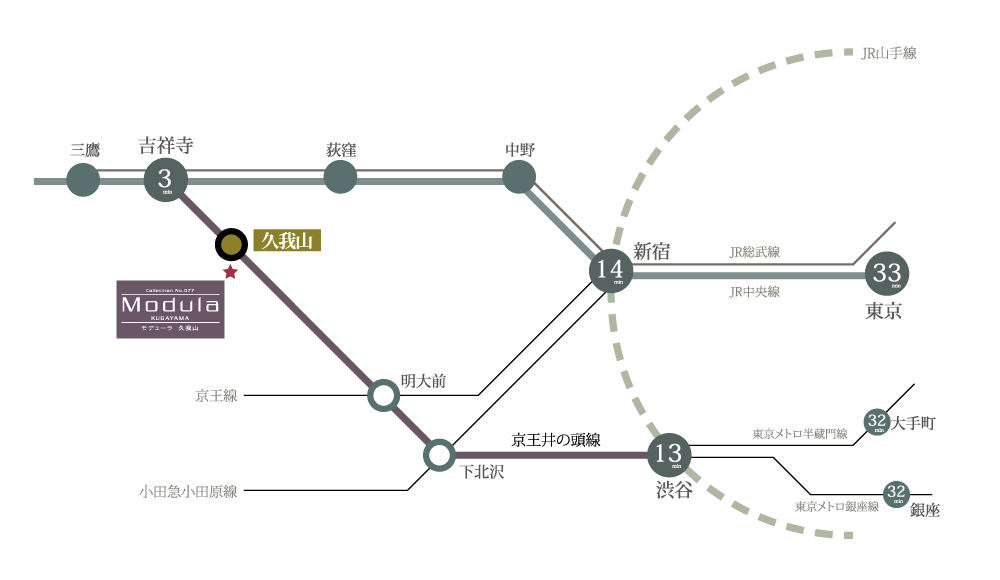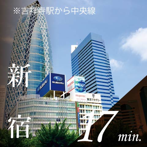 久我山での暮らしは、交通アクセスの利便性が1つの大きな魅力。最寄りの「久我山」駅には京王井の頭線の急行も停車し、「渋谷」駅には13分、「吉祥寺」駅まで3分でアクセス可能。「渋谷」駅からはJR山手線、埼京線、湘南新宿ライン、東京メトロ銀座線、半蔵門線、副都心線、東急東横線、東急田園都市線に乗り換えができ、都内から郊外、横浜方面へもスムーズにアクセスできます。