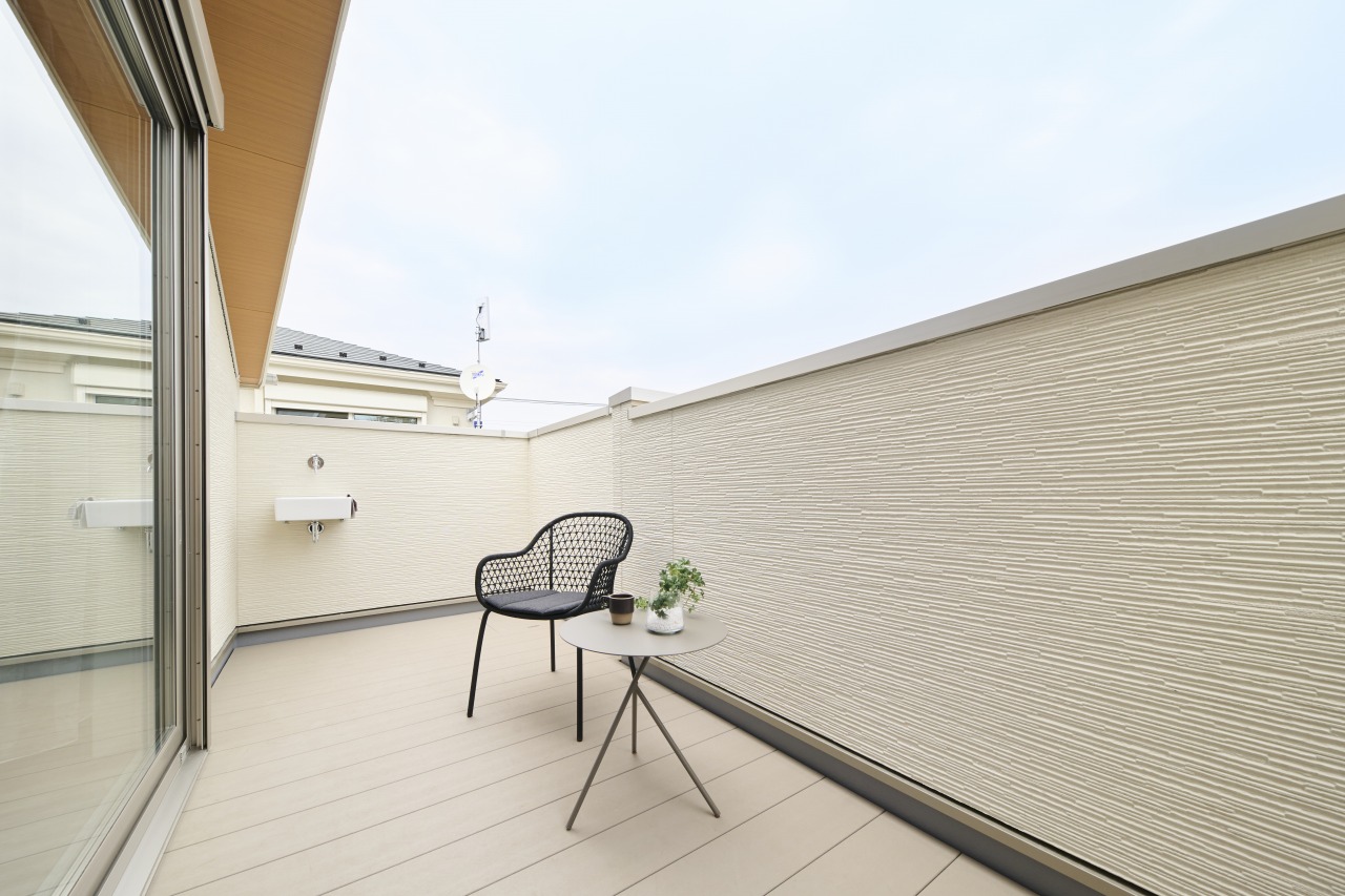 リビング横の「周囲の視線を遮る手すりあるバルコニー」は、隣家と目が合わないよう設計されていて、のんびり過ごしている時に視線を感じません。高い壁でプライバシーを確保しながらも朝日がたっぷりと当たる、大好きな場所です。