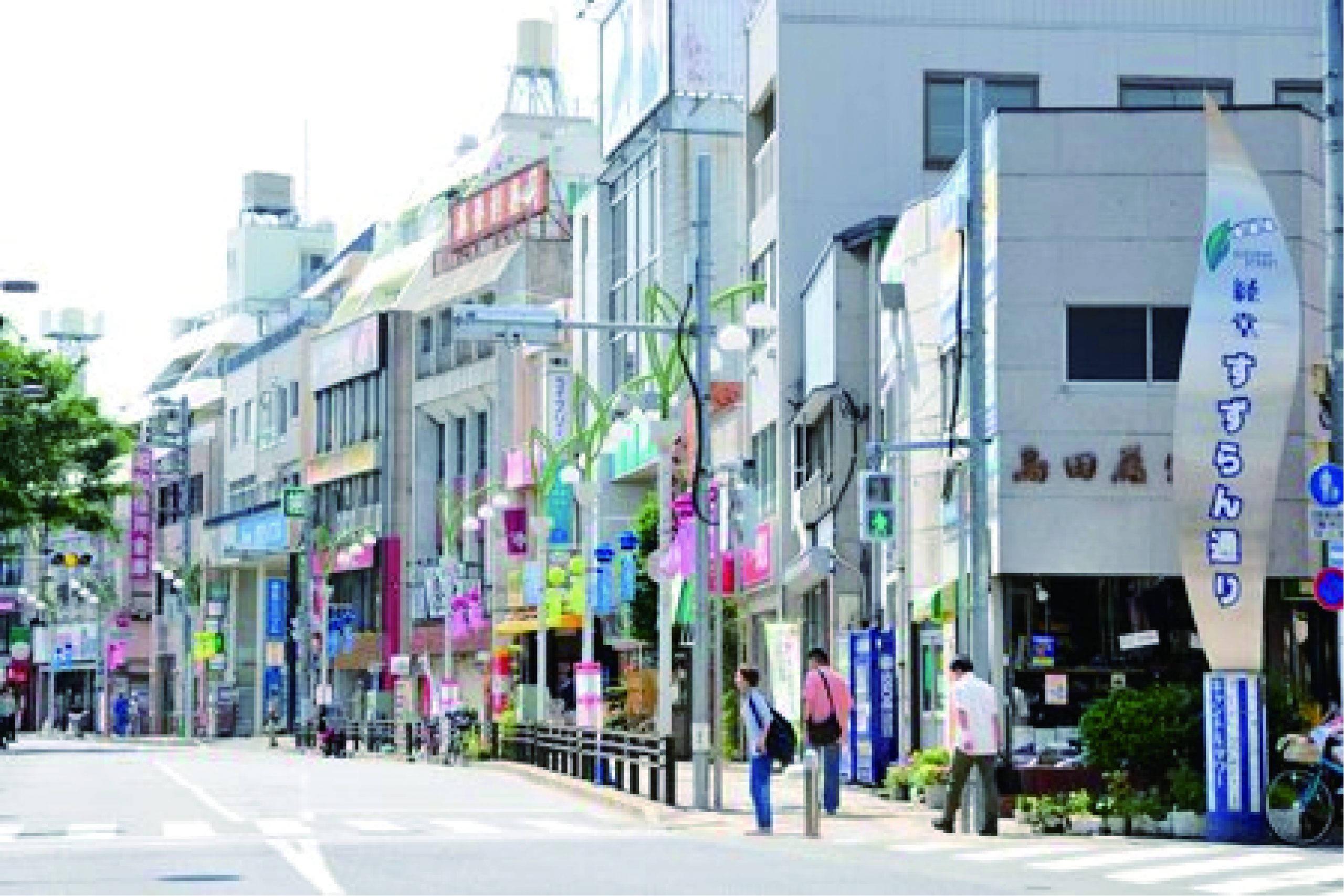 「駅前通り」は西口から「日大通り」になり、学生の通学路となっています。