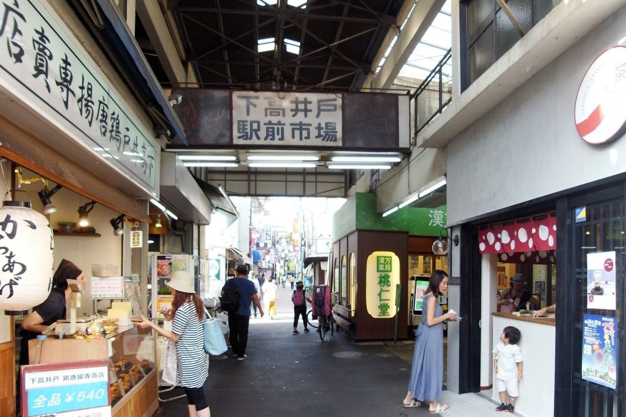 下高井戸駅前には小さいながらも市場があり、また周辺には小売商店が立ち並びます。