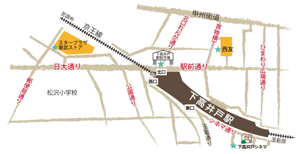 「下高井戸駅」前には多数の商店街があり、北口だけでも「北口れんが通り」「買い物横丁」、京王線に交差する「駅前通り」があります。