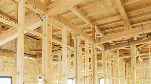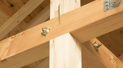 精度の高い指定プレカット工場で加工され、柱・梁1本1本強度が検査されています。