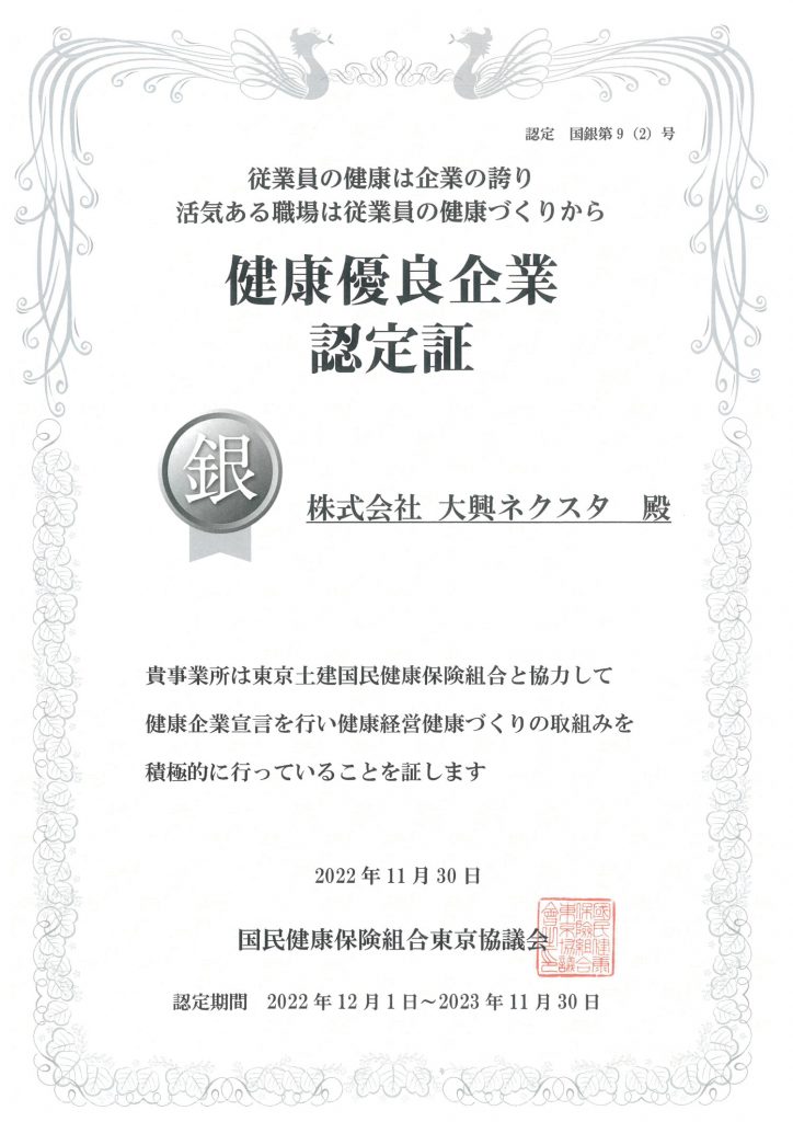 大興ネクスタは、国民健康保険組合東京協議会に「健康企業宣言」を行い、次の通り積極的な健康経営への取り組みを実施し、2022年11月30日付で、「健康優良企業(銀の認定証)」を更新いたしました。