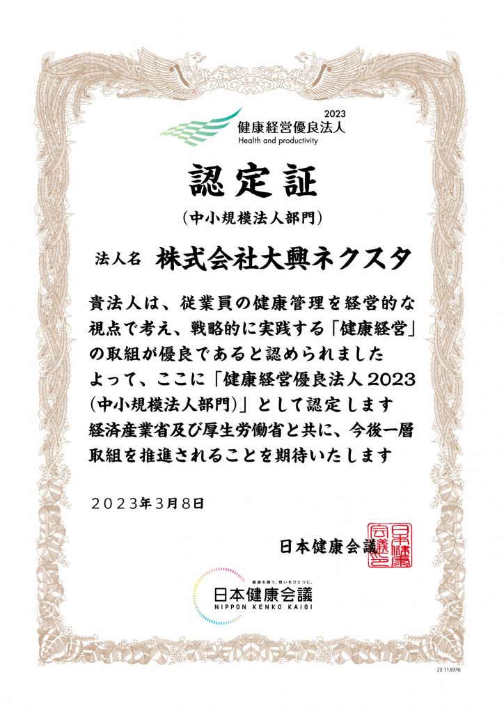 大興ネクスタは、2023年3月8日、経済産業省と日本健康会議が共同で選定する「健康経営優良法人2023(中小規模法人部門)」に認定されました。